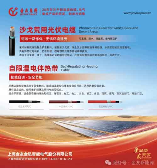 针对沙漠戈壁极端温差、强风沙侵蚀、强紫外线、昼夜温差悬殊等严苛工况,金友定制化沙戈荒专用特种铠装防护电缆,具备耐候、抗腐蚀、防沙蚀、长寿命、高稳定等硬核属性,完美适配大基地复杂敷设环境;配套自限温电伴热带,精准解决管线防冻保温、冬季运维冻堵痛点,为电站25年持续安全发电筑牢根基。